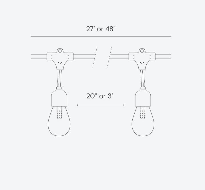Each strand is 27 feet long with 12 S14 bulbs spaced 20 inches apart (the lighted portion is 20 feet).
