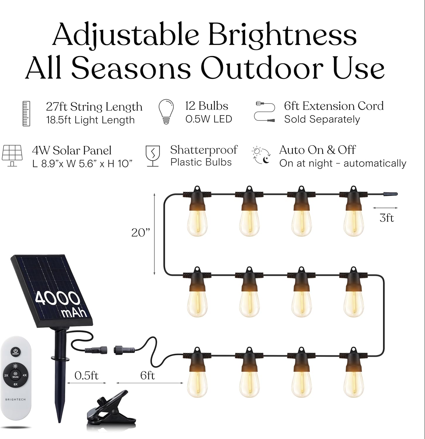 Brightech Ambience Pro Solar Powered Outdoor String Lights, 27 ft Commercial Grade Waterproof Patio Lights, 12 Edison Bulbs, Shatterproof LED String Lights for Outside, Porch - 1W Soft White