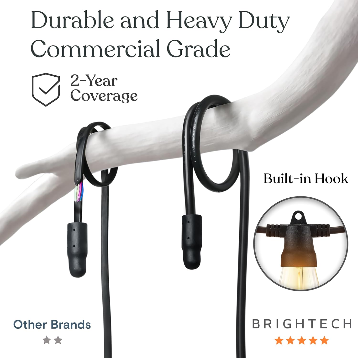 - Commercial Grade WeatherProof Patio Lights with Shatterproof S14 Bulbs: Brightech’s Ambience Pros hanging string light has our WeatherTite technology - withstood winds up to 50MPH, rain & snow. The bulbs are shatterproof plastic shells, with heat resistance up to 122 degrees Fahrenheit. Flexible heavy-duty cord withstands the wear of indoor and outdoor use. Make your pergola, porch or other space to be an enticing, relaxing and soothing winter holiday retreat with Brightech LED outdoor lights.