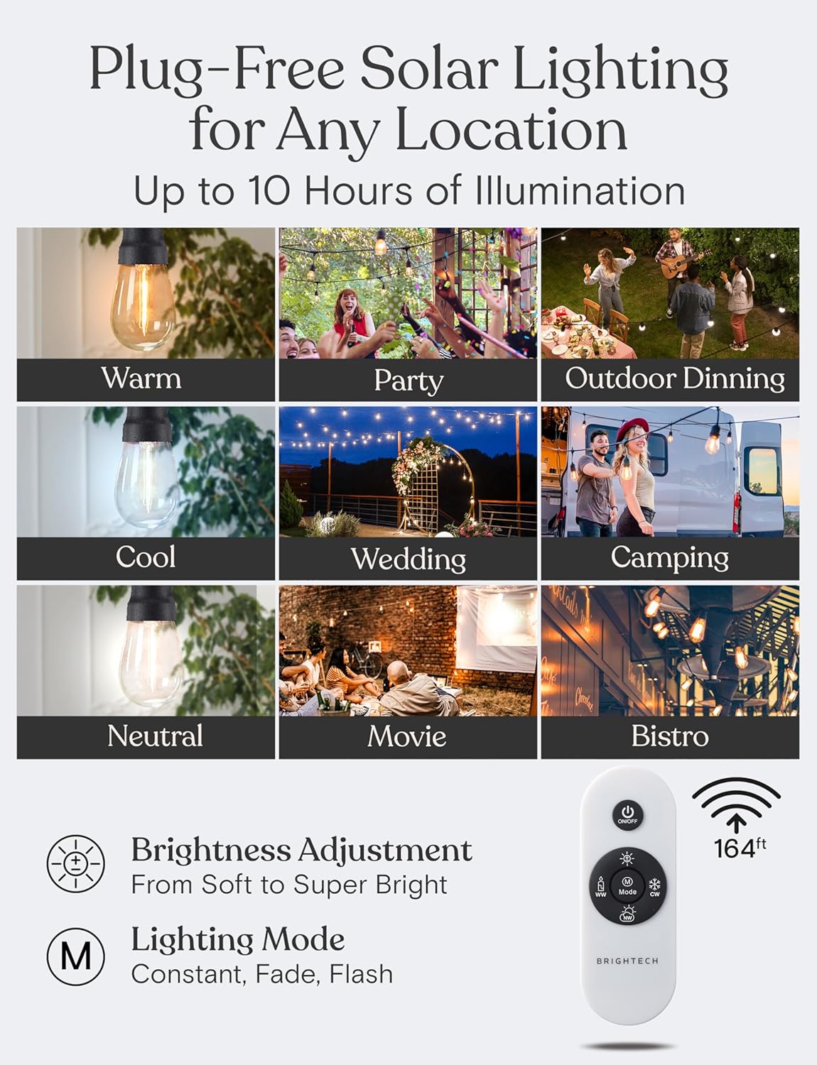 - Flexible Installation & Widely used Patio Lights: Solar patio lights string don't need an outlet, place the solar panel almost anywhere with the included stake and clip. Brightech outdoor decorative bistro lights are the perfect decoration for balcony terrace, garden, Bistro, pergola, gazebo, tent, barbecue, city roof, market, cafe, umbrella, dinner, wedding, birthday, party, Xmas etc.