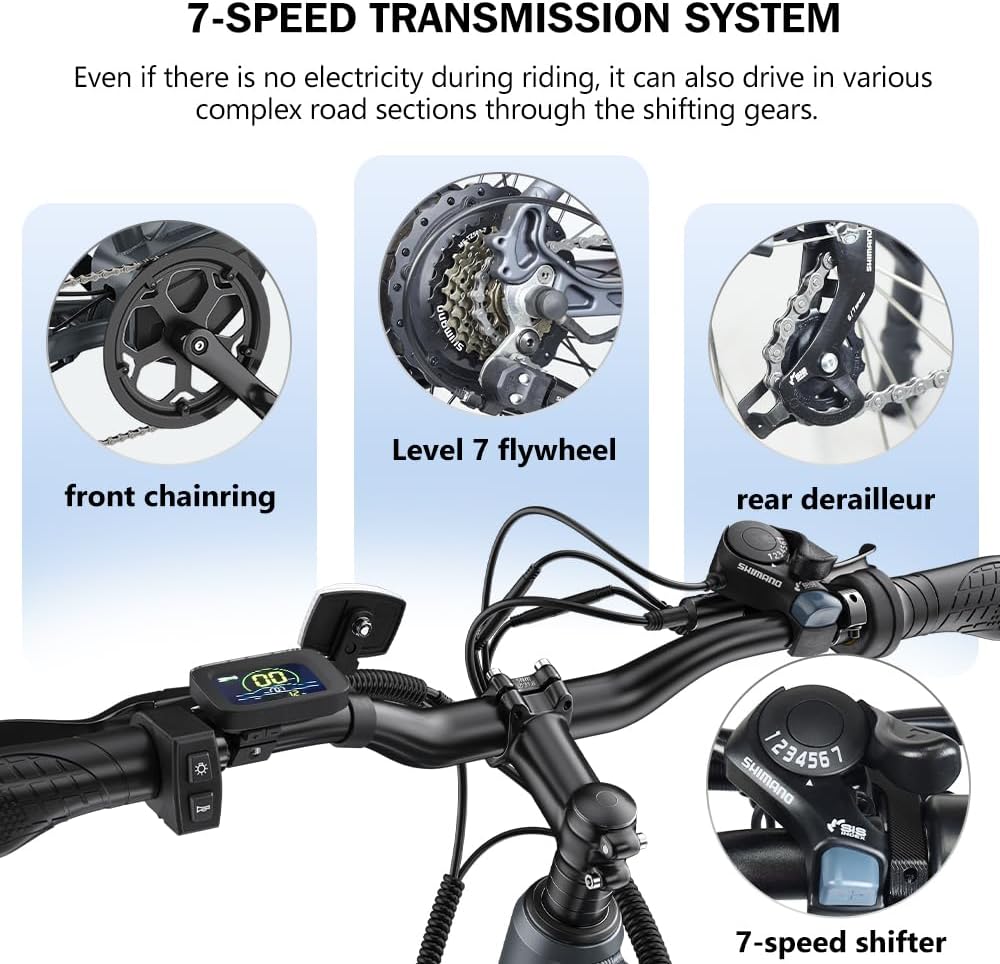 - 🚴♀️7-SPEED GEAR & DUAL DISC BRAKES -The electric mountain bike is equipped with a professional 7-speed gear finger shifters convenient to ride uphill, downhill or pure acceleration. The front and rear dual disc brakes provide gstable and strong braking force. It ensure the safety of your Hidoes B5 electric road bike riding.
